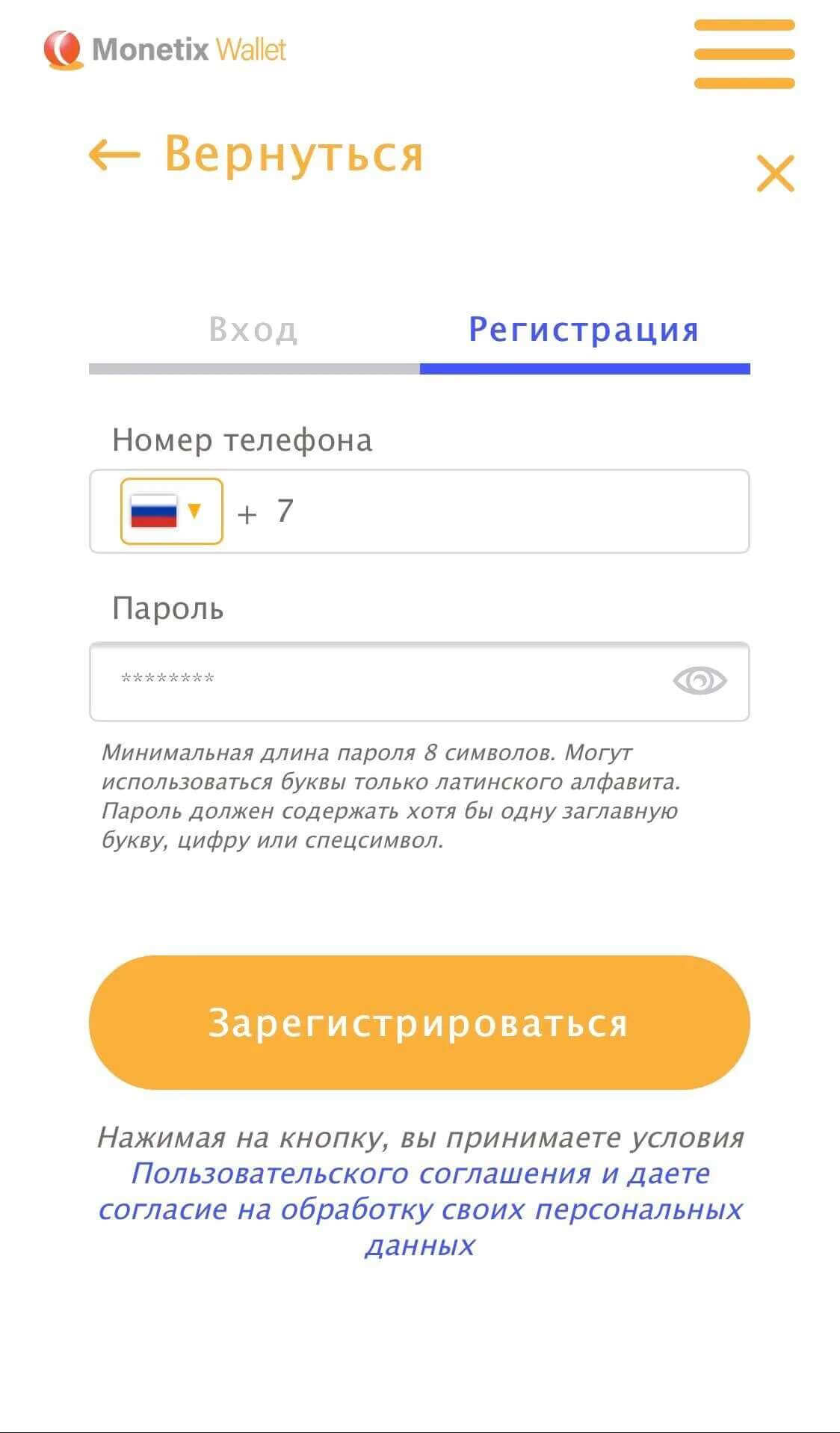 - 3. Zadejte své telefonní číslo a heslo, stiskněte tlačítko "Registrovat", potvrďte prostřednictvím sms.