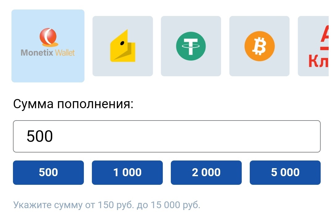 - 6. Chcete-li provést vklad na místě, musíte si v pokladně vybrat. způsob vkladu prostřednictvím peněženky Monetix. Vyberte požadovanou částku vkladu a klikněte na tlačítko "Pokračovat".