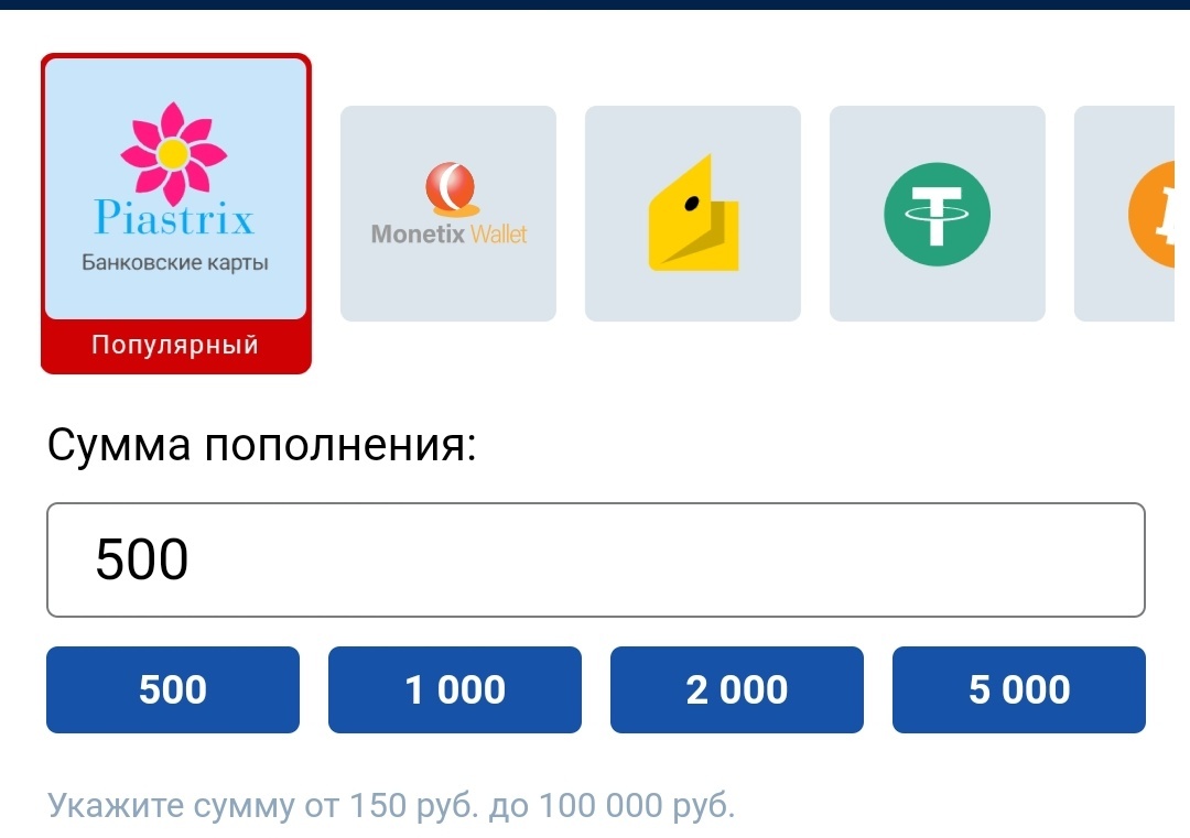 - 6. Chcete-li provést vklad na místě, musíte si v pokladně vybrat. způsob vkladu prostřednictvím služby Piastrix. Vyberte požadovanou částku vkladu a stiskněte tlačítko "Pokračovat".